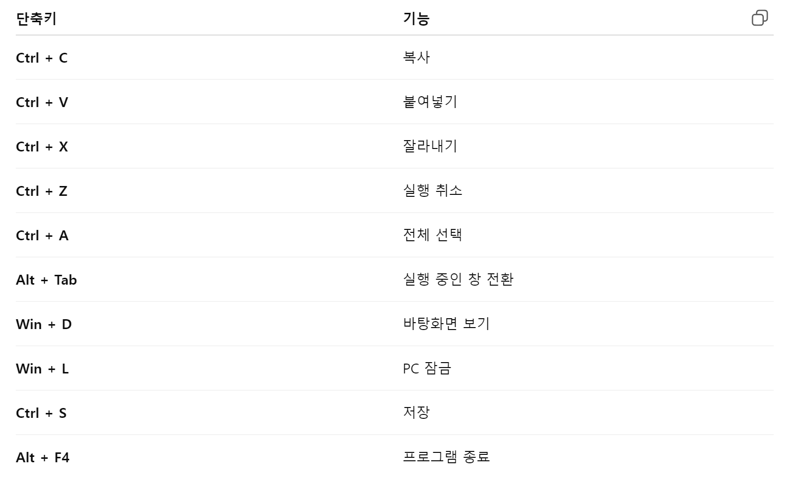 | Ctrl + Shift + Esc | 작업 관리자 |